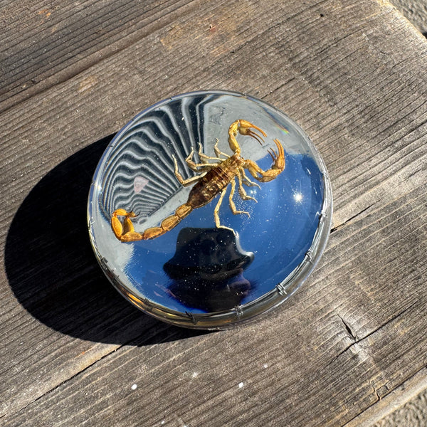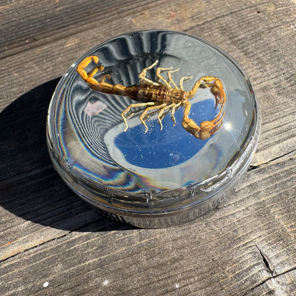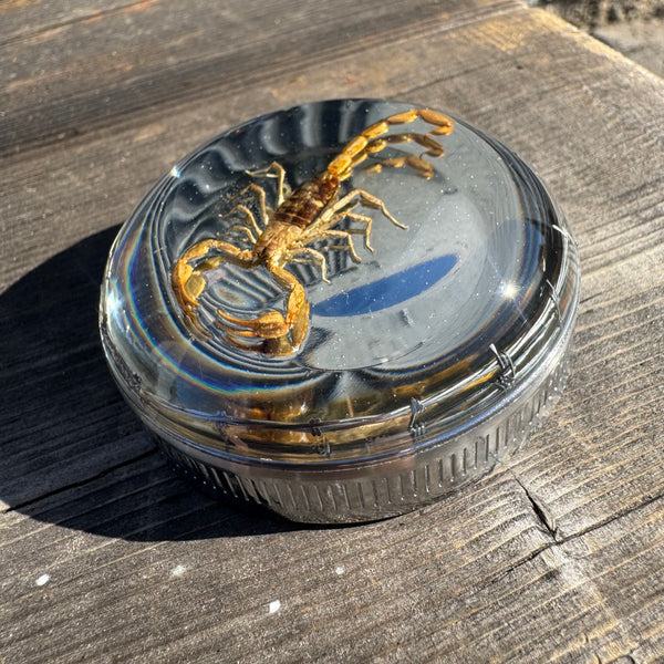 Real scorpion and mini barbwire set a top a clear resin base bayonet style gas cap.