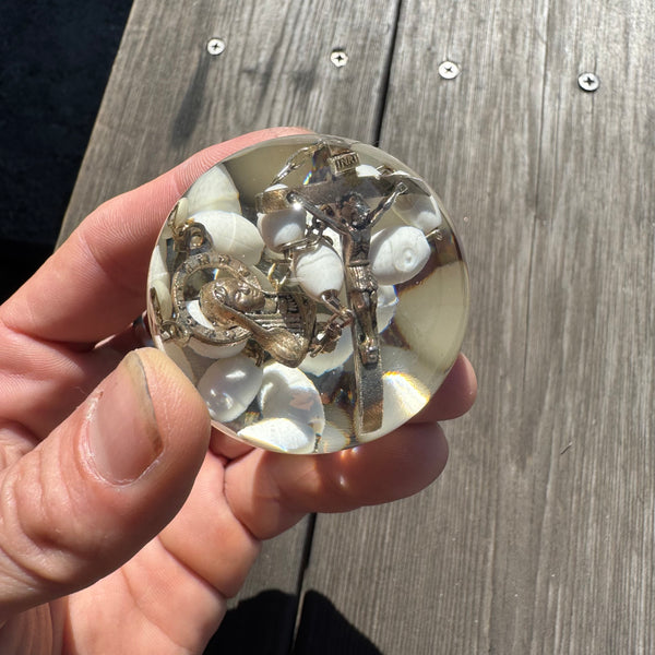 Rosary with whire beads and silver cross set in a clear 2 inch diameter resin sphere.