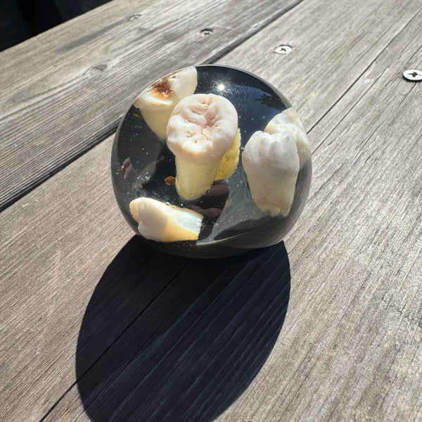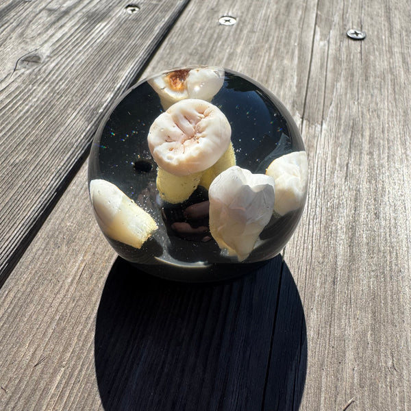 Real teeth set in a clear 2 inch diameter resin sphere a top a black base.