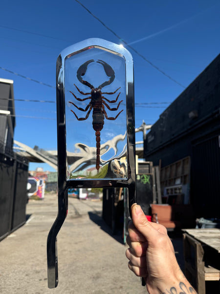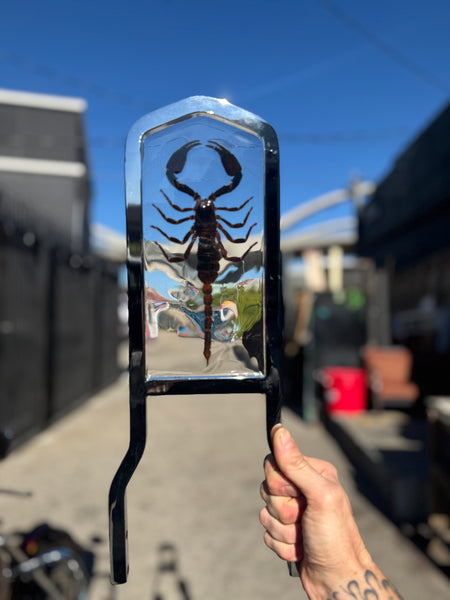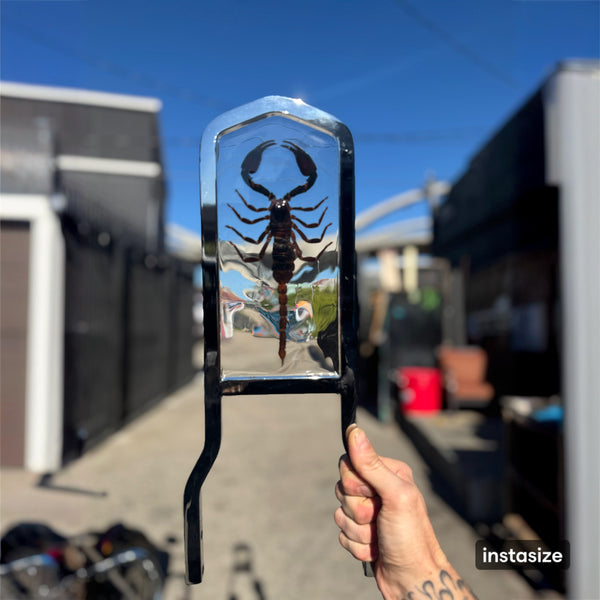 16’’ tall square stock sissy bar with real scorpion set in resin. Sissy bar measures 6 3/4 inches wide and fits 2003 and earlier Sportsters, 1982-1994 FXR, and Dynas.