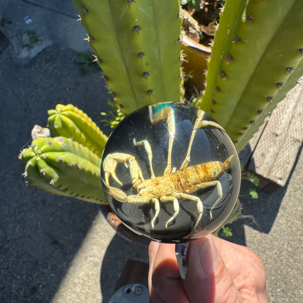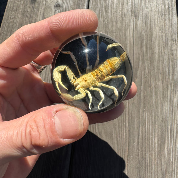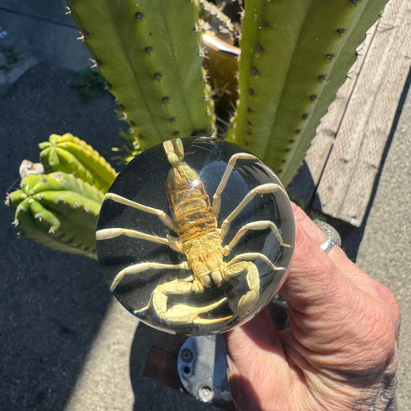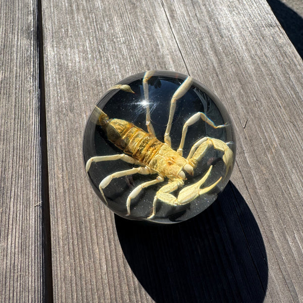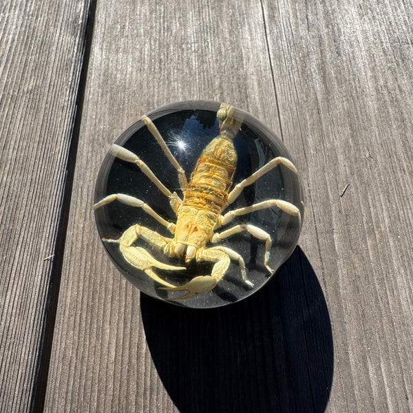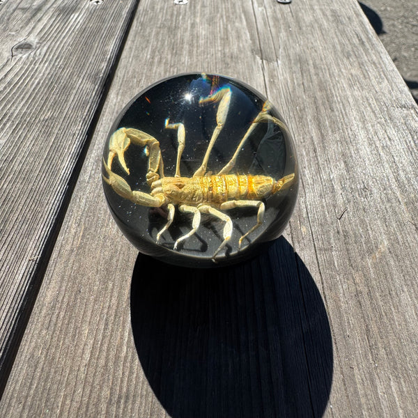 Real Tan Scorpion set in a clear 2 inch diameter resin sphere a top black base.